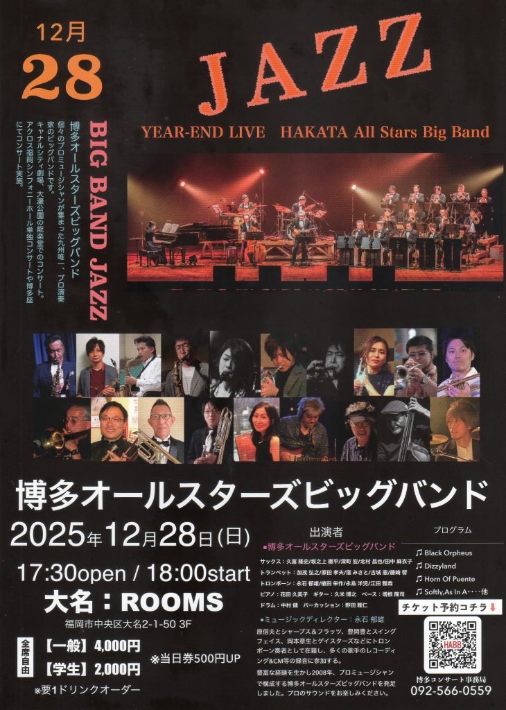 2025年12月28日(日)福岡市中央区大名の「ROOMS」にて福岡を中心に活動するプロミュージシャンで構成されたビッグバンド、「博多オールスターズビッグバンド」のライブが開催されます。