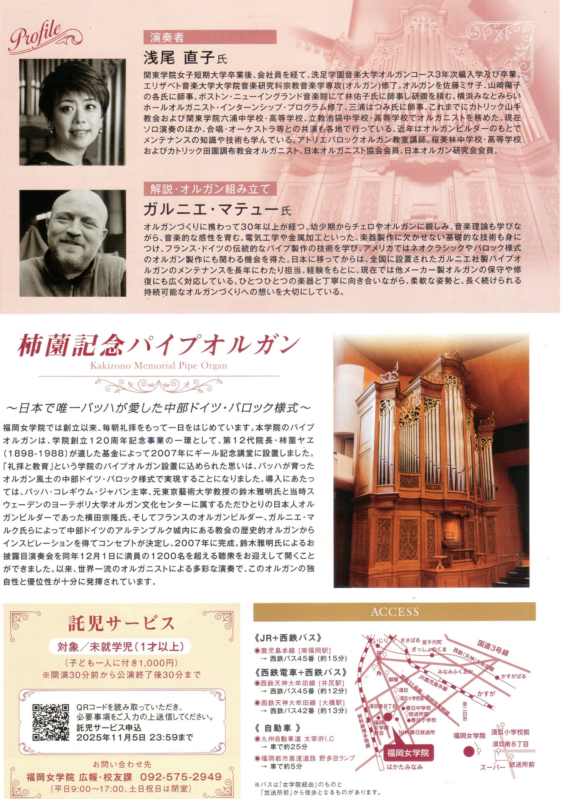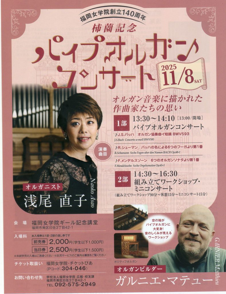 11月8日(土)福岡女学院創立140周年 柿薗記念 パイプオルガン コンサート