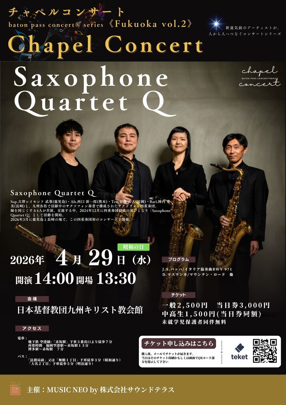 4月29日(水・祝)バトンパスコンサート®シリーズ 福岡チャペルコンサートvol.2 Saxophone Quartet Q