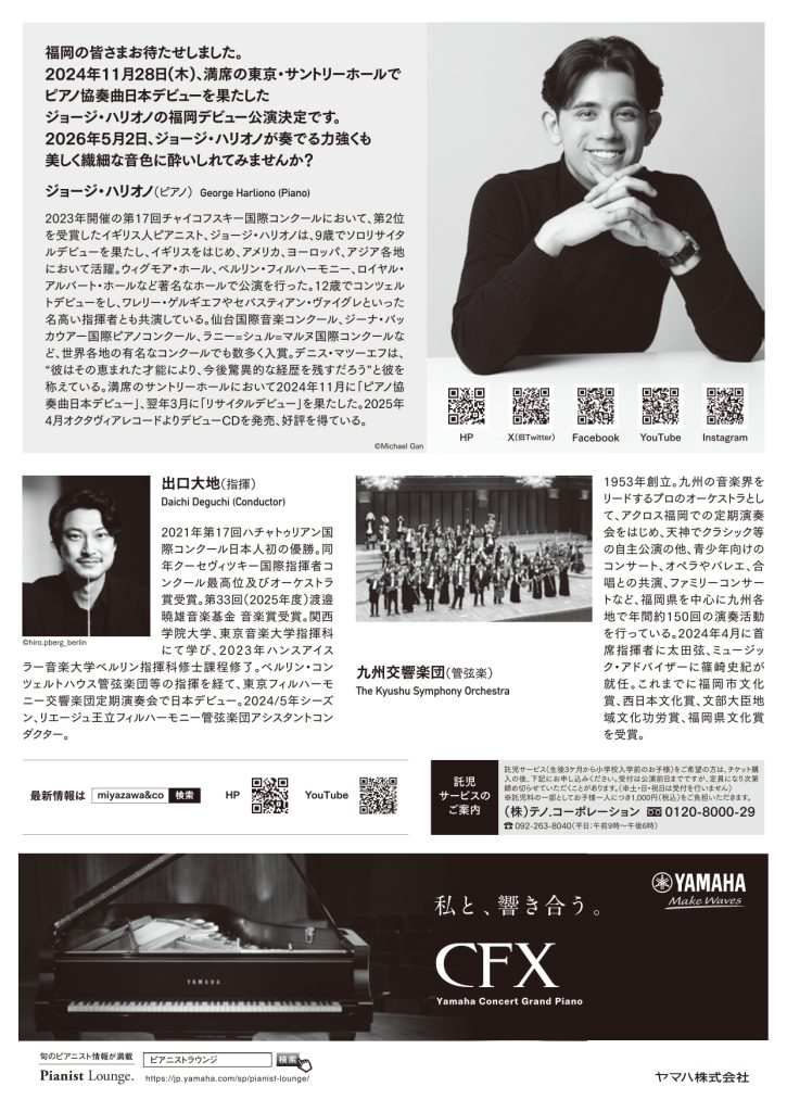 5月2日(土)九州交響楽団 ジョージ・ハリオノ ピアノ協奏曲福岡公演