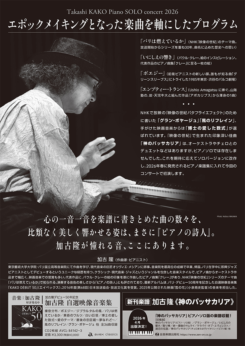 4月19日(日)加古隆 ピアノソロ・コンサート2026